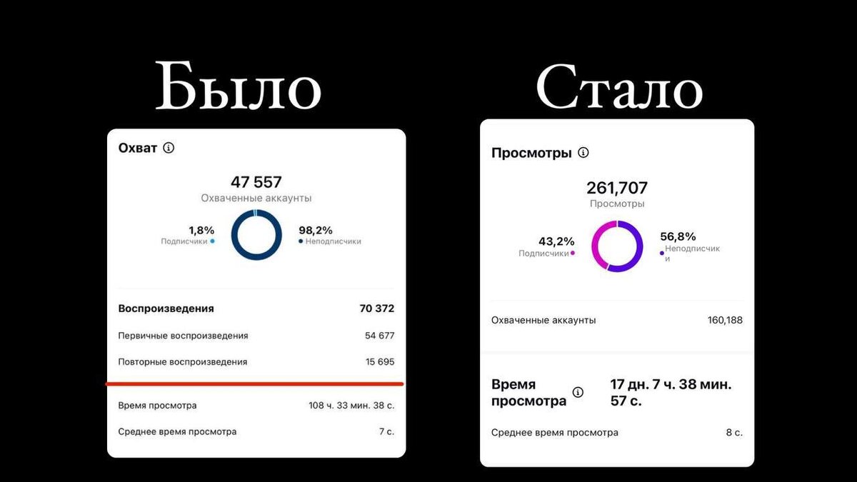 У многих упали охваты на рилс и возможно это связано с тем, что сейчас не засчитывают просмотры, как раньше. (Но официального подтверждения я не нашла) ❗️В статистике к видео пропал критерий «повторные воспроизведения» Был момент, когда резко у всех увеличились просмотры в 2 раза, тк инстаграм* показывал не охват (количество уникальных пользователей), а просмотры (если 1 человек смотрит рилс 10 раз, то они засчитывались). У вас как? Упали просмотры в последнее время? * Meta — запрещена в РФ