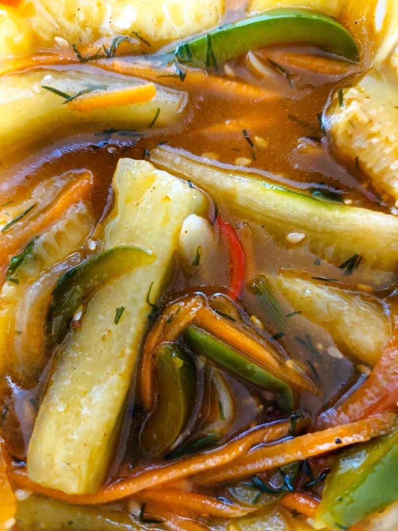Ингредиенты: огурцы крупные - 3 кг лук - 2 шт. морковь - 3шт. перец болгарский - 3 шт. чеснок - 6 средних зубчиков перец чили - 3 шт. молодой зелёный лук - 1 небольшой пучок укроп свежий - 1 небольшой пучок паприка сладкая - 2 ст.л. кориандр молотый или в зёрнах - 1 ч.л. кунжут - 1 уп. перец чёрный молотый - 1/4 ч/л соль - 1ст.л. соль адыгейская - 1 ч.л. сахар - 2 ст.л. соус соевый - 3 ст.л. масло подсолнечное без запаха - 100 мл уксус 9% - 3 ст.л. Почистить огурцы (если кожица не грубая можно не чистить) и нарезать тонкими брусочками 5-6 см. Лук и перцы тонко нашинковать, морковь натереть на корейской тёрке, укроп и чеснок отдельно мелко порубить. Зелёный лук нарезать кусочками примерно по 3 см. Сложить всё в глубокую ёмкость, добавить соль, сахар, паприку, чёрный перец, укроп, соевый соус и уксус, всё хорошо перемешать. Соль и сахар можно откорректировать по вкусу. Слегка обжарить кунжут и кориандр, в конце добавить чеснок, тонкой струйкой влить масло и закипятить. Кипящую смесь выл