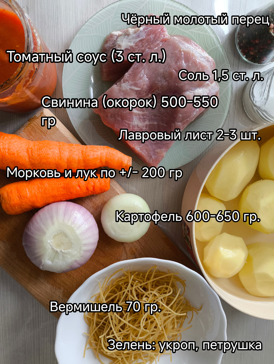 Если вам захотелось супа, но возиться с бульоном не нравится, то есть неплохая альтернатива в виде вот такого супа. Получается не менее сытно и вкусно! Да и времени на приготовление уходит поменьше. #суп #рецепт #вермишель Ингредиенты: Посолил суп я за 5 минут до готовности мяса. На 2,5 литра воды идеально с 1 ст.л. соли с горкой или 1,5 ст.л. без горки. Вермишель всегда добавляю либо за пару минут до выключения газа, либо сразу после. Она успевает приготовиться и не превратиться в тесто. Приятного аппетита!