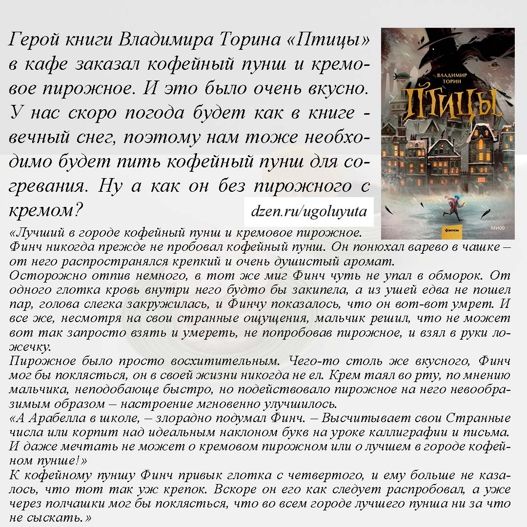 Вот здесь писала про книгу Владимира Торина "Птицы": Главный герой этой книги однажды попадает в кафе, где заказывает кофейный пунш и самое вкусное в городе кремовое пирожное. У нас (к счастью) город не такой, как в книге, поэтому кафе такого нет. Но пунш и пирожные мы можем приготовить сами. На 1 порцию: