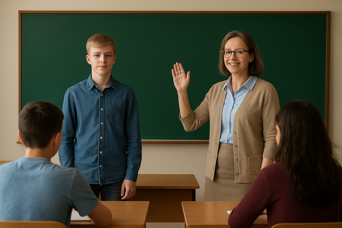 Максим почувствовал, как его сердце замерло. В этот момент он ожидал, что его представят, но всё равно не был готов к тому, что на него будут обращены взгляды всего класса.