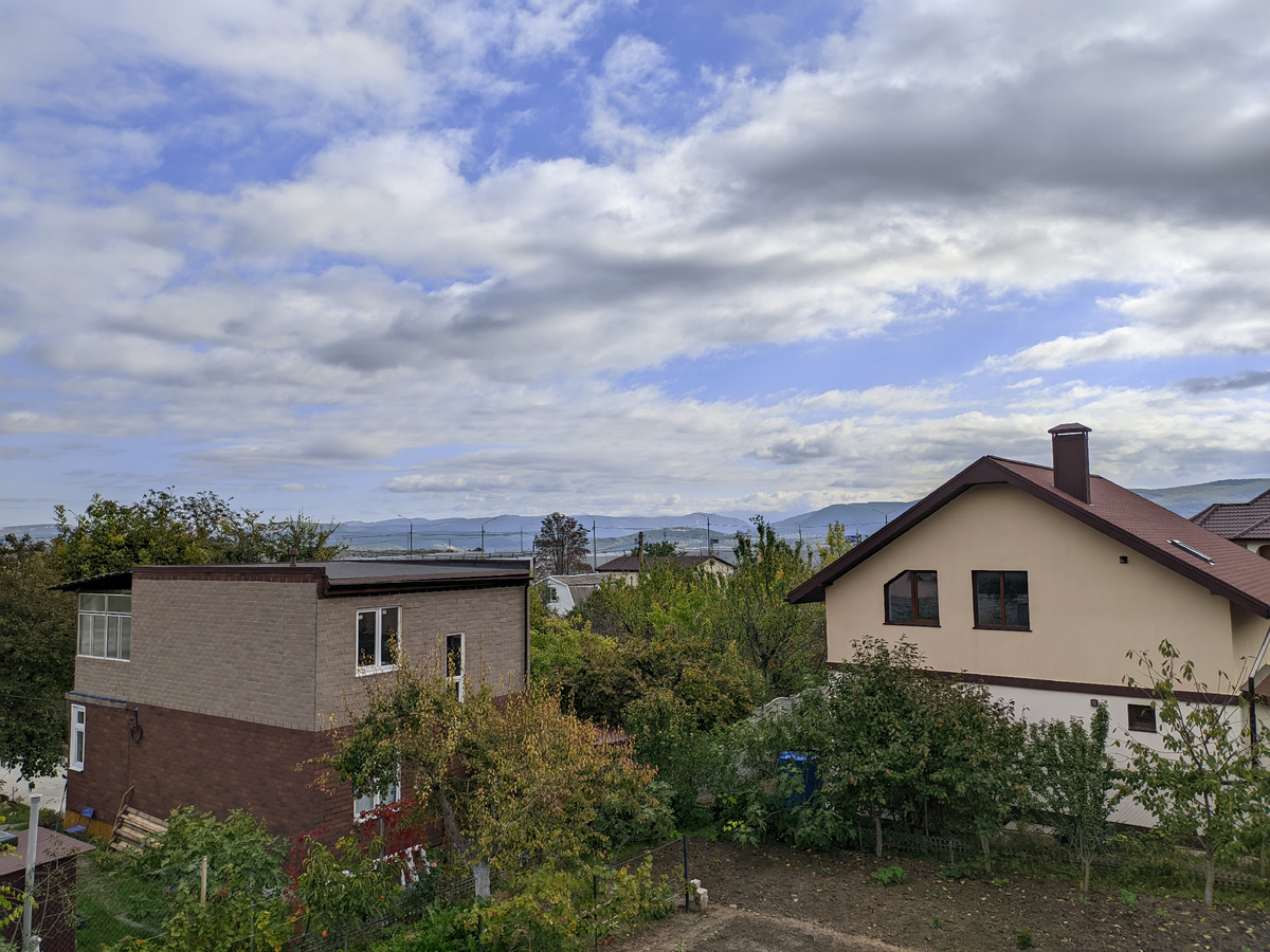 Дома ничего не поменялось за время нашего отсутствия, та же пасмурность, вот еще хурма спеет. Справа виднеется грецкий орех, вся площадка за домой сегодня была завалена скорлупой, хвосты спешат, грызут.