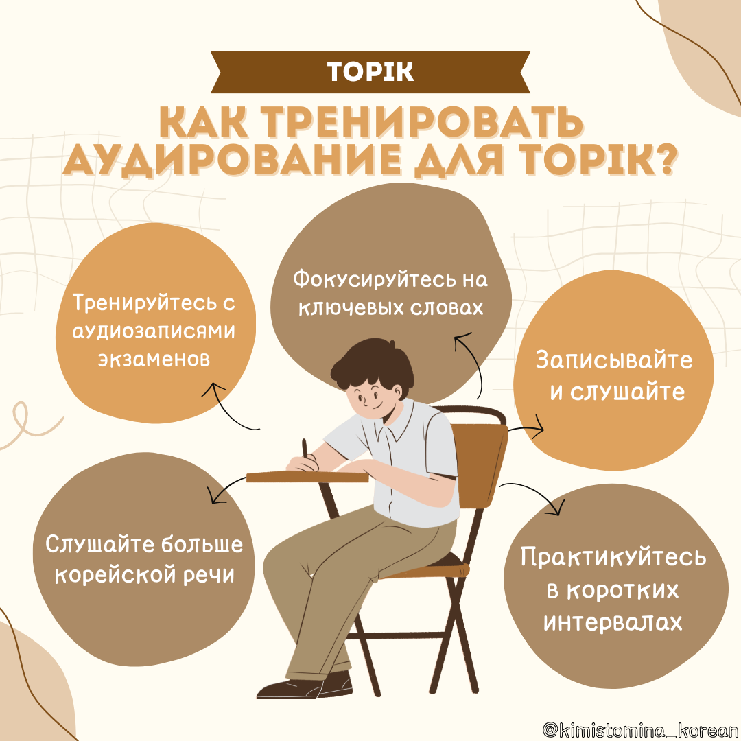 Раздел аудирования на TOPIK проверяет вашу способность понимать устную речь на корейском языке. Чтобы подготовиться к этому разделу, следуйте следующим советам: - Слушайте больше корейской речи. Смотрите корейские фильмы, слушайте подкасты или новости на корейском. Это поможет привыкнуть к скорости и стилю речи носителей языка. - Тренируйтесь с аудиозаписями экзаменов. Используйте аудиоматериалы из прошлых тестов, чтобы понять, как звучат типичные вопросы на TOPIK. - Фокусируйтесь на ключевых словах. Во время экзамена вам не обязательно понимать каждое слово. Учитесь ловить ключевые фразы и слова, чтобы уловить общий смысл сказанного. - Записывайте и слушайте. Попробуйте записывать свою речь или читать тексты вслух и затем слушать записи. Это поможет улучшить восприятие звуков и ритм корейской речи. - Практикуйтесь в коротких интервалах. Разделите тренировку на короткие сессии по 15-20 минут, чтобы не перегружаться информацией. ✨Хотите попробовать реальные задания по аудиров