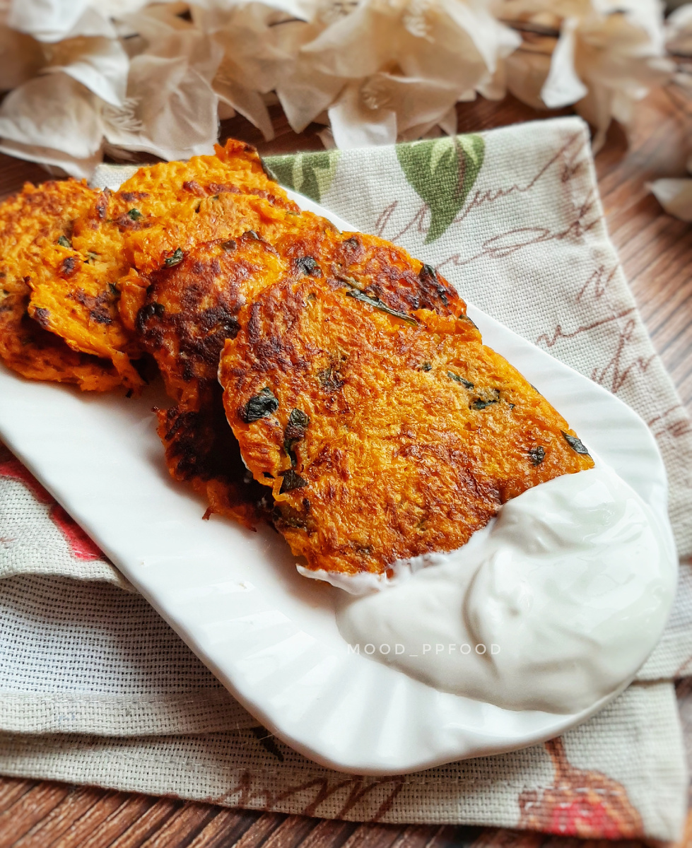 Батат - 300 г. Шпинат - 10 г. Яйцо куриное - 1 шт. Овсяная мука - 10 г. Масло д/жарки, у меня топлёное - 15 г. Соль, перчик. 1️⃣ Батат чистим и натираем на мелкой тёрке. Отжимаем, лишнего сока будет не много, но он будет 🙂 2️⃣ Шпинат (листиками) моем, сушим и нарезаем на маленькие кусочки. 3️⃣ В миске объединяем: натертый батат, шпинат, 10 г. муки, разбиваем яйцо, добавляем соль и перец. Перемешиваем. 4️⃣ Разогреваем сковороду и смазываем маслом. 5️⃣ Из бататной массы делаем маленькие лепёшки, выкладываем на сковороду и прижимаем. Убавляем огонь, на средние значения, накрываем крышкой и жарим до румянца с двух сторон. Перед каждой партией, всего их у меня было две по 3 штуки, смазываем маслом. Подаём вкусняхи со сметаной. Приятного аппетита 😋