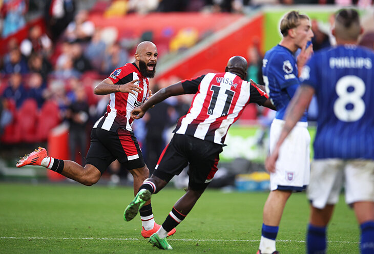 Только «Сити» дал контраст. Сразу четыре матча АПЛ в субботу – с драматичными развязками. Это «Ман Сити» спокойно дома обыграла «Саутгемптон» – 1:0 благодаря голу Эрлинга Холанда уже на пятой минуте, а остальные развлекались. «Брентфорд» теперь забивает на последних минутах таймов. Так спасли матч против «Ипсвича» с 0:2 «Брентфорд», в прошлом туре наконец-то переставший забивать на первых минутах, задал новый тренд – теперь голы в конце таймов. Против «Ипсвича» это принесло три очка в сложном домашнем матче. К 31-й минуте «Брентфорд» уже проигрывал 0:2 – забили Сэмми Смодич и Джордж Херст. Но в конце тайма сравняли: на 44-й забил Иоанн Висса, а в добавленное время Харрисон Кларк отправил в свои. В начале второго тайма этот же Кларк, впервые вышедший в стартовом составе, привез пенальти, а потом удалился за вторую желтую. Благодаря голу Бриана Мбемо с 11-метрового «Брентфорд» повел 3:2, «Ипсвич» в меньшинстве сравнял – навес замкнул Лиам Делап (да, сын короля аутов Рори Делапа). А дальш