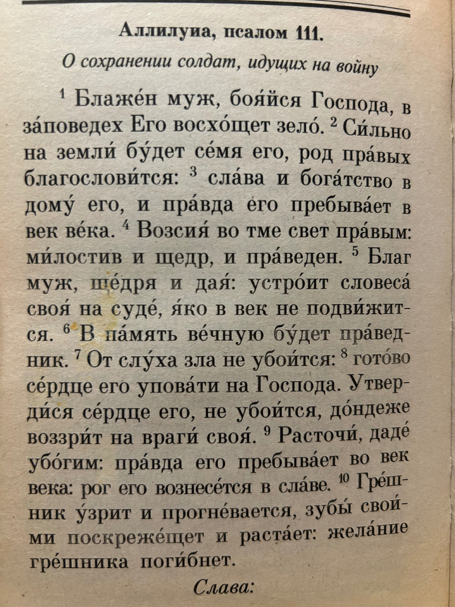 Псалом о сохранении солдат, идущих на войну: ⠀ Псалом 111 1 Блаже́н муж, боя́йся Го́спода, в за́поведех Его́ восхо́щет зело́. 2 Си́льно на земли́ бу́дет се́мя eго́, род пра́вых благослови́тся: 3 сла́ва и бога́тство в дому́ eго́, и пра́вда eго́ пребыва́ет в век ве́ка. 4 Возсия́ во тме свет пра́вым, ми́лостив и щедр, и пра́веден. 5 Благ муж, ще́дря и дая́: устро́ит словеса́ своя́ на суде́, я́ко в век не подви́жится. 6 В па́мять ве́чную бу́дет пра́ведник. 7 От слу́ха зла не убои́тся, 8 гото́во се́рдце eго́ упова́ти на Го́спода. Утверди́ся се́рдце eго́, не убои́тся, до́ндеже воззри́т на враги́ своя́. 9 Расточи́, даде́ убо́гим, пра́вда eго́ пребыва́ет во век ве́ка, рог eго́ вознесе́тся в сла́ве. 10 Гре́шник у́зрит и прогне́вается, зубы́ свои́ми поскреже́щет и раста́ет, жела́ние гре́шника поги́бнет. ⠀ Псалом 111 на русском: ⠀ 1 Блажен муж, боящийся Господа, возлюбил он заповеди Его. 2 Сильны будут на земле потомки его, род праведных благословен будет; 3 Слава и богатство в доме его, и правд