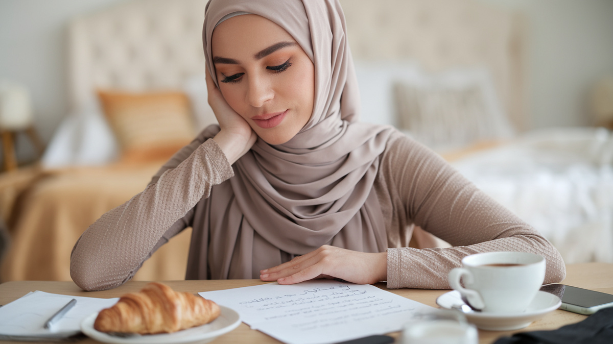 - 6:30 — Пробуждение и уход за собой. Утренний душ, лёгкий макияж, укладка под хиджаб — всё, чтобы начать день свежей и ухоженной.