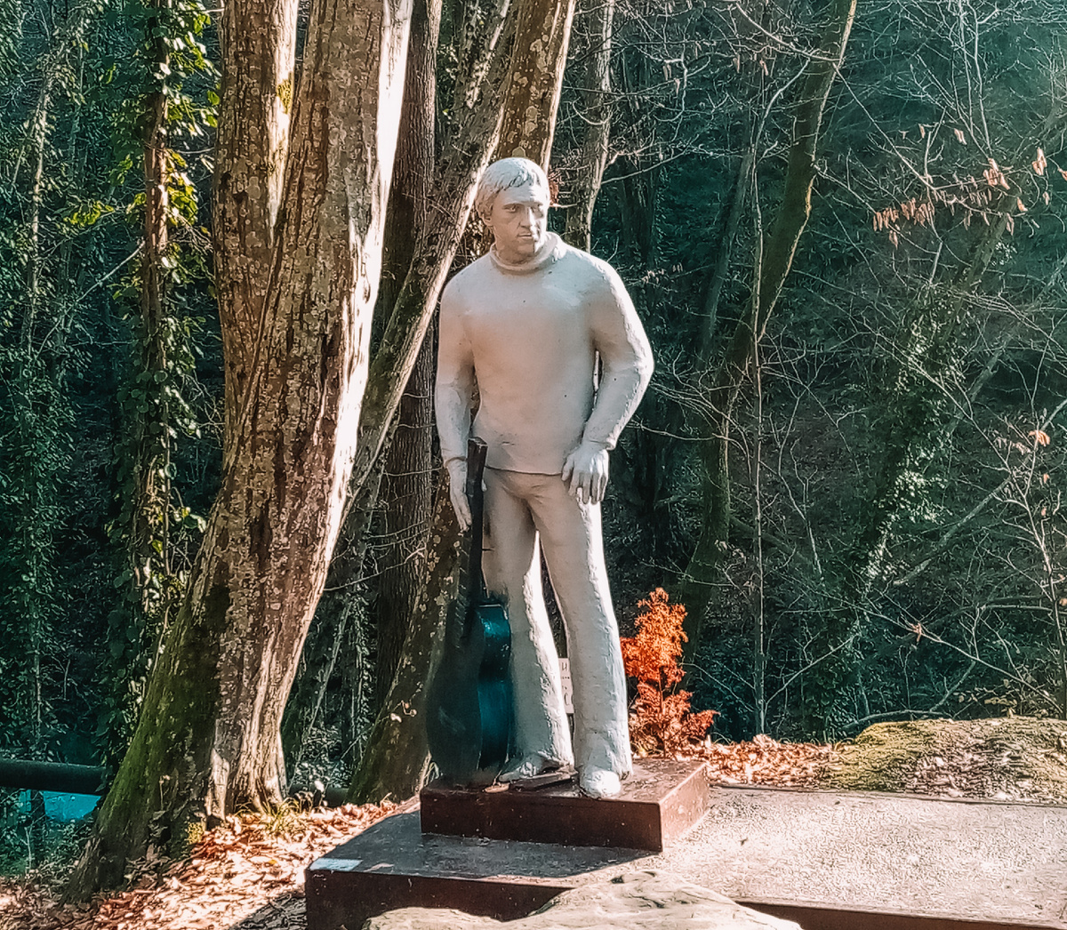 Одна из причин, почему я обожаю Сочи, заключается в сочетании городского комфорта с пышной южной растительностью. Если вы, как и я… - не зарабатываете на индивидуальные экскурсии, - не любите толчею групповых экскурсий, - путешествуете с детьми, которые в принципе не любители экскурсий …то Агурские водопады хороши своей близостью и возможностью посетить их самостоятельно. Ближайшая остановка называется «Санаторий Спутник», от которой около полутора километров до кассы в заповедник. По пути встретится скульптура Высоцкого… Что она делает в таком месте? Легенда гласит, что он путешествовал на круизном лайнере с Мариной Влади . Одна из остановок была в Сочи, где именитого артиста сразу «украли», отвезя на эту поляну и закатив настоящее застолье в честь такого гостя. Естественно, кавказское застолье быстро не заканчивается, время стоянки лайнера уже закончилось, но капитан и остальные пассажиры терпеливо ждали, когда Высоцкого вернут обратно, чтобы продолжить путешествие. На память о