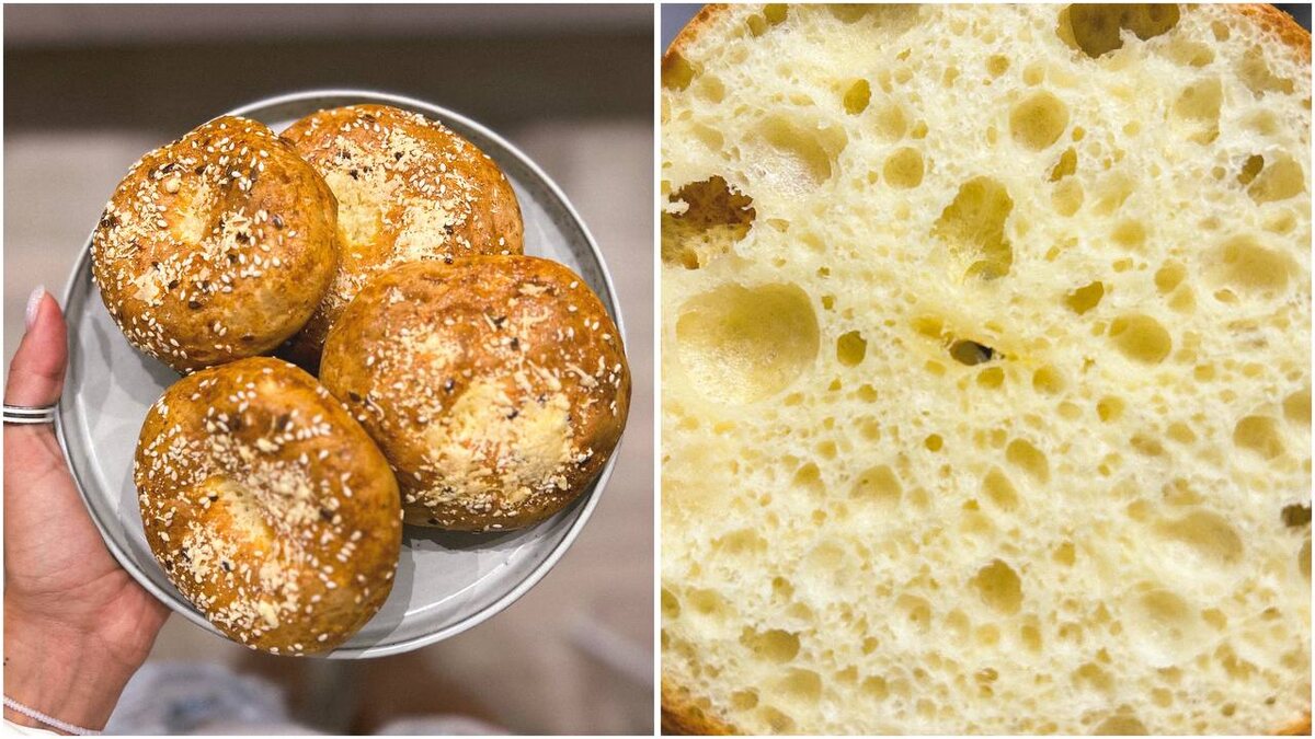 КБЖУ на один: 174/11/3/25 Я долго пыталась приготовить бейглы по разным рецептам, но всё было не слава Богу. То растекались, то не были воздушными. То альтернативная мука давала яркий привкус "чего-то не того". Но нашла тот самый рецепт идеальных творожных бейглов, которые не навредят фигуре. Ингредиенты: • творог (зерно) - 180г • мука - 130г • яйцо - 2шт • разрыхлитель - 1 ч.л. • соль по вкусу • кунжут, семечки 1️. Смешать творог, яйцо и белок от второго яйца, муку, разрыхлитель, соль. 2️. Замесить тесто. 3️. Разделить тесто на 4 части, сформировать бейглы. 4️. Смазать бейглы желтком, посыпать кунжутом. 5️. Выпекать при температуре 180 градусов 40-50 минут. Дальше мы разрезаем бейглы вдоль и включаем фантазию! Моя любимая начинка для бейглов: