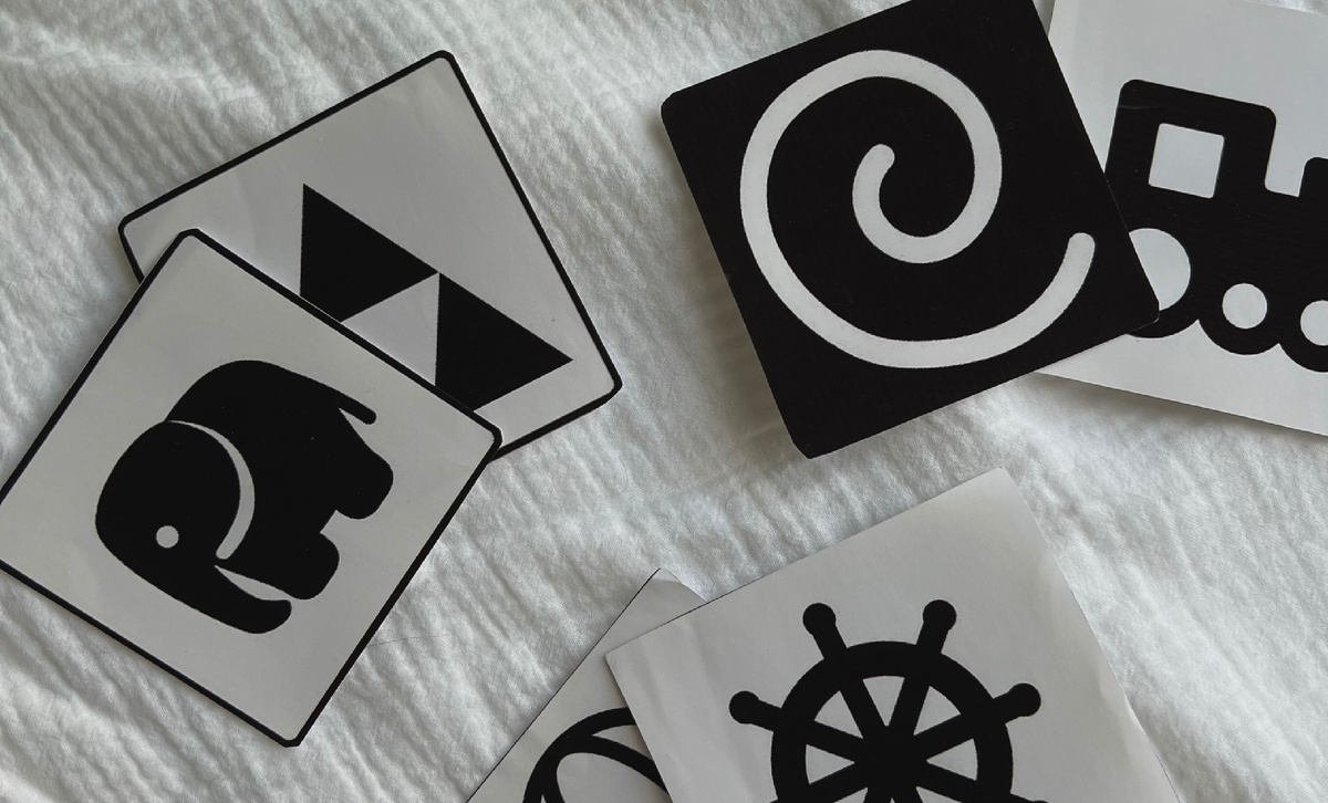 Чем занять малыша во время бодрствования от 0-2 месяцев? В таком возрасте у малышей время активного бодрствования занимает 10-20 минут. Чтобы провести время с пользой расскажу о своих вариантах занятий! Помогают фиксировать зрение на предмете и прослеживать за ним! Важно положить такие картинки на расстоянии 20-30 см от малыша и по возможности направить источник света позади ребенка, чтобы карточки были хорошо освещены и свет не напрягал глазки ребенка. Поэтому смело кладите малыша затылком к окошку и показывайте карточки! В первый месяц жизни малышам легче фокусироваться на простых геометрических фигурах, клетках, полосочках. Со временем показывайте рисунки посложнее! В результате таких занятий улучшаются зрительные функции! Такие карточки есть на маркетплейсах. Целые наборы с разными уровнями сложности рисунков. Я же решила найти понравившиеся картинки в пинтерест, распечатала и вырезала их! Замечательно завлекает малыша и учит фокусироваться на предмете. Повторюсь, что важно по