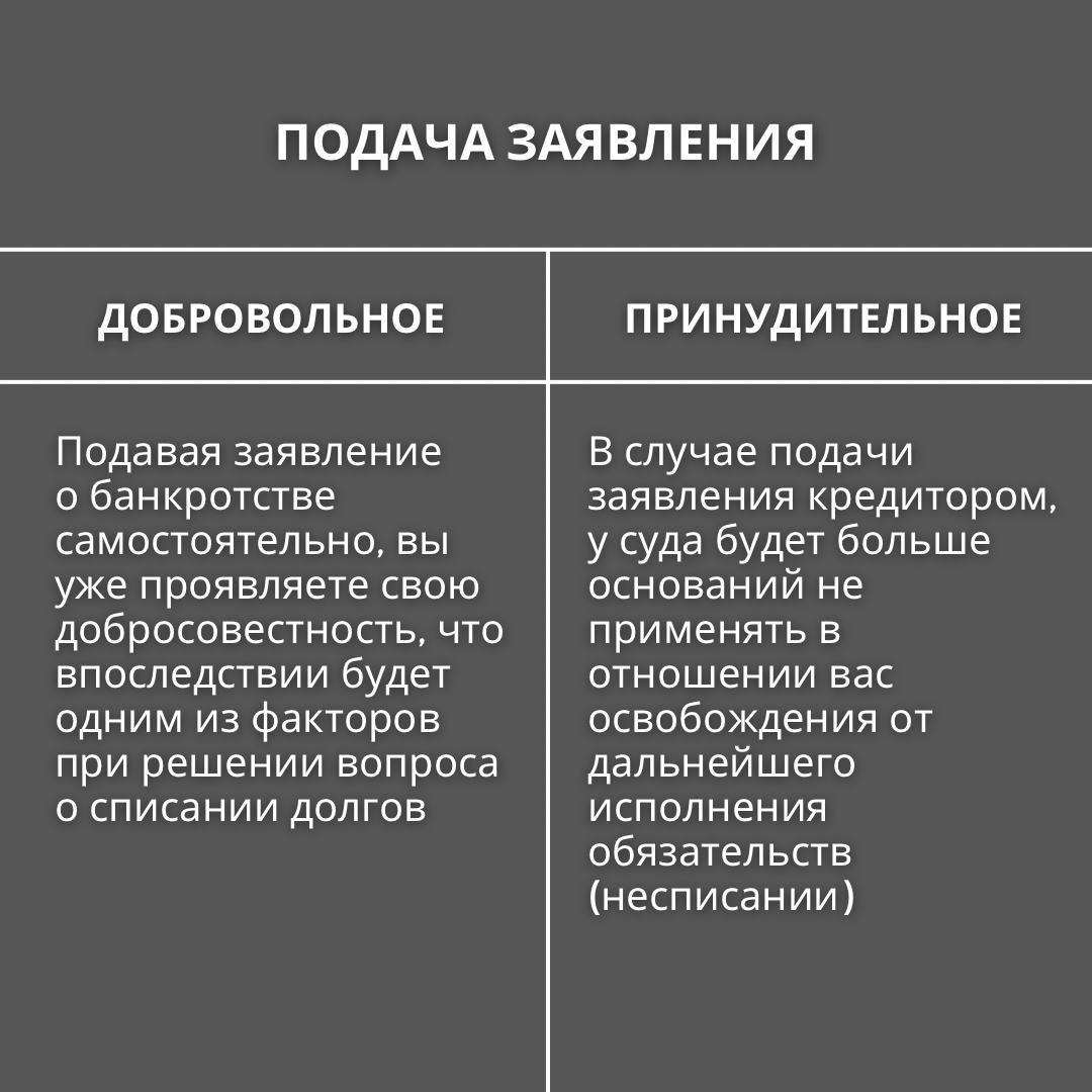 В чём же особенности и различия между добровольным и принудительным банкротством физлиц/ИП? Для начала скажем, что принудительное банкротство чревато неблагоприятными последствиями, в том числе несписанием долгов, продажей всего имущества должника, а также оспариванием сделок. В карусели наглядно отразили, в чем разница этих видов банкротства. Какой способ вам ближе — решать вам :) В случае наличия у вас тяжелой финансовой ситуации, мы предлагаем вам здраво оценивать ситуацию, а также обращаться к юристам за квалифицированным анализом перспектив процедуры банкротства. Записаться на консультацию: https://clck.ru/3CgiGg