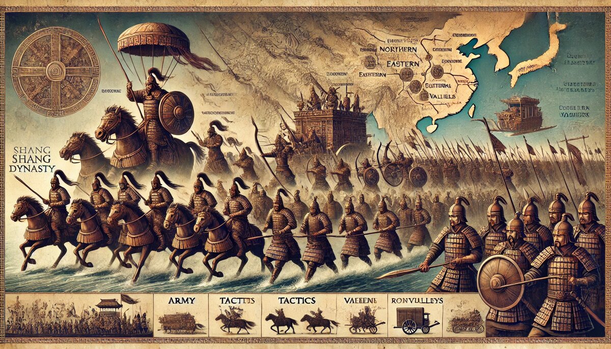 Династия Шан (ок. 1600–1046 до н.э.) — первая исторически подтверждённая китайская династия, которая оставила значительный след в развитии военного искусства. Путь её армии от примитивных племенных отрядов до сложной военной структуры отражает развитие китайской военной традиции. В ранний период (ок. 1600–1300 до н.э.) войска Шан представляли собой сборы племенных отрядов под командованием аристократии. Эти отряды были мобильными, использовали тактику засад и внезапных атак. Основное оружие включало бронзовые топоры и кинжалы, примитивные луки с каменными наконечниками и деревянные щиты. Военные кампании того времени были направлены на подчинение соседних племён и захват ключевых ресурсов, таких как медь и нефрит. Примером являются завоевания в долине реки Хуанхэ и на южных землях, которые обеспечили династию ценными ресурсами и защитой от набегов.