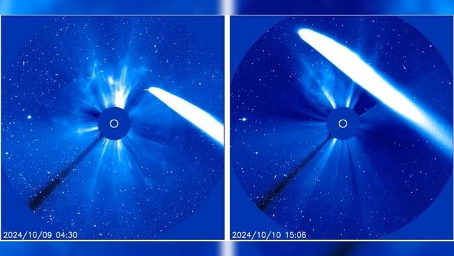 Новые снимки, полученные с помощью широкоугольного спектрометрического коронографа LASCO, установленного на солнечном телескопе Военно-морской исследовательской лаборатории США (NRL), раскрывают удивительные детали прохода кометы C/2023 A3 (Tsuchinshan-ATLAS) мимо Солнца. На этих изображениях видно, как за кометой остаётся внушительный пылевой хвост, особенно заметный в начале октября, когда она приблизилась к Земле и была видна невооружённым глазом. По словам исследователей NRL, этот пылевой хвост был заметен в окрестностях Солнца на протяжении нескольких дней, даже после того, как сама комета удалилась. Начиная с 7 октября, инструмент LASCO зафиксировал ядро кометы C/2023 A3, а её массивный хвост оставался видимым до 11 октября. Специалисты NRL отмечают, что после того, как ядро кометы исчезло из поля зрения, её пылевой след оставался, привлекая внимание учёных уникальными свойствами. LASCO, установленный на совместном аппарате NASA и Европейского космического агентства SOHO, занимае