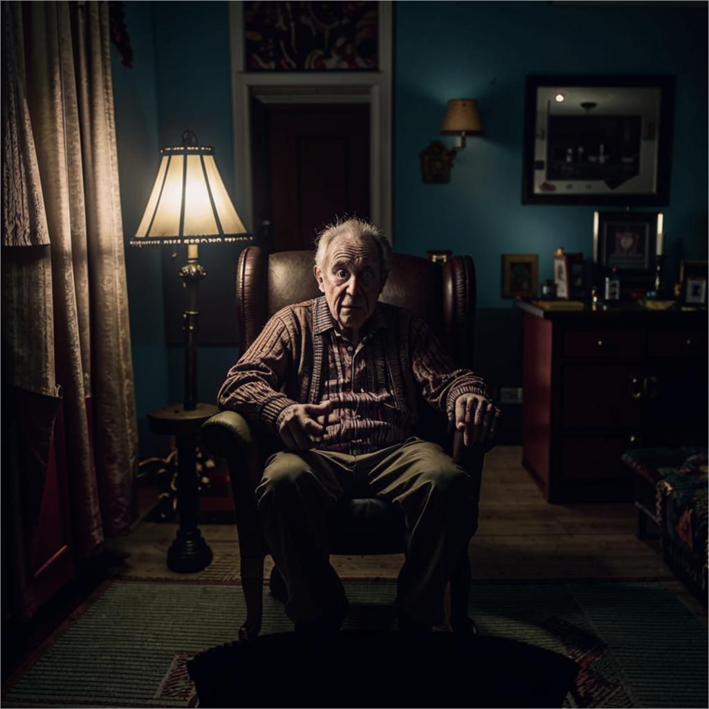 В старом доме на окраине города жил одинокий старик по имени Генри. Он был прикован к инвалидной коляске и проводил свои дни в тишине и одиночестве, окруженный лишь старыми вещами и воспоминаниями. Однажды ночью, когда Генри сидел в своем кресле, читая книгу при слабом свете лампы, он услышал странный шорох. Он казался таким тихим и едва различимым, но Генри был уверен, что слышит его. Он напряг слух, пытаясь определить источник звука, но шорох то появлялся, то исчезал, как будто кто-то или что-то пыталось остаться незамеченным. Генри старался не обращать внимания на шорох и продолжал читать, но с каждым мгновением он становился все громче и навязчивее. Он медленно передвинул свою инвалидную коляску через темный коридор, следуя за звуком, который привел его на чердак. Дверь была слегка приоткрыта., и Генри почувствовал, как мурашки побежали у него по коже. Он протянул руку и толкнул дверь, позволяя слабому свету лампы осветить темное помещение. И что же он увидел? В углу комнаты сидела
