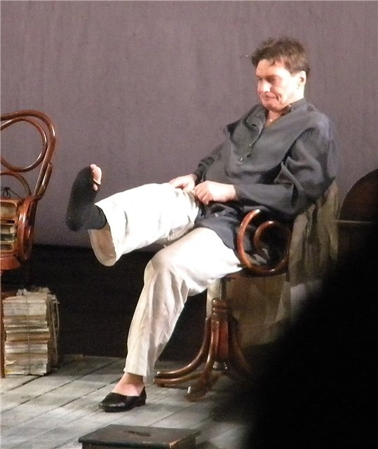 С самого начала и весь спектакль очень живая и непосредственная реакция зала. Очень мило Соня отрывает с ноги, со штанины Астрова репейник, когда он выходит на позицию для монолога о лесах... (- Слушай, где они его берут, а? Или не настоящий все же). Репейника вроде нет, но отдирает его Юля так, как будто он есть, а потом подразумевается, что он с внутренней стороны ноги, Астров делает шаг и она как бы замечает этот репейник и отдирает его.