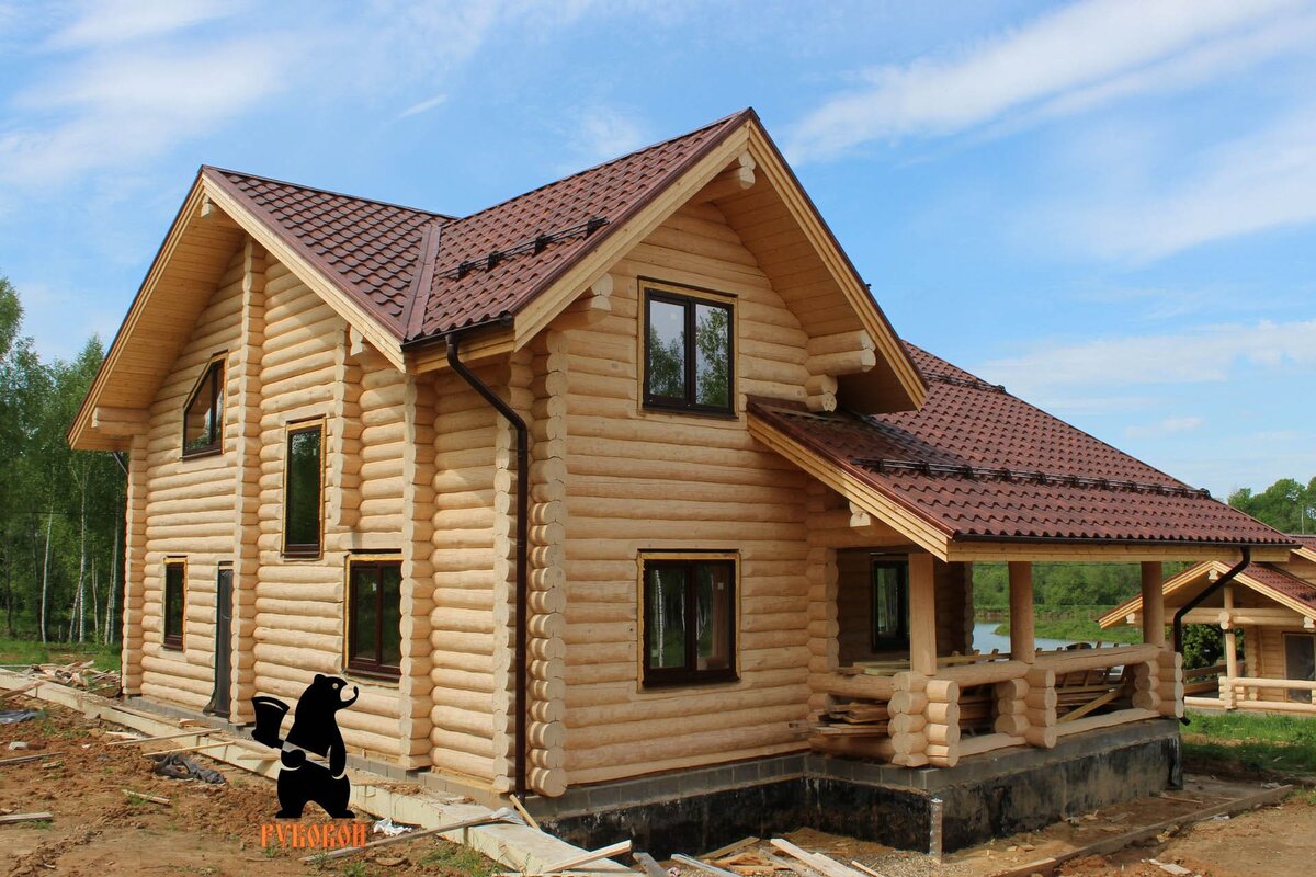 Сруб изначально был изготовлен на Производстве из лесоматериалов с традиционной окоркой бревна и собран на участке Заказчика под временную (черновую) кровлю. Которую сделали из-за длины скатов крыши и наличия схождения скатов (ендов). Впоследствии дом отшлифовали и смонтировали постоянную кровлю.