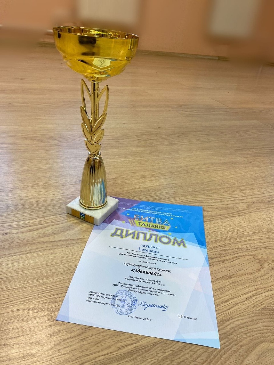 💥 Наши новости. Хореографический коллектив "Эдельвейс" Дома культуры "Родник" ГО Чехов спал победителем в фестивале "Битва талантов" 💃26 октября хореографический коллектив "Эдельвейс" Дома культуры "Родник" принял участие в XIII Открытом фестивале-конкурсе художественной самодеятельности среди молодежи "Битва талантов", который проходил в ДК "Мечта" с. Дубна. 🏆Коллектив стал Лауреатом I степени!🥇 Мы поздравляем ребят и их руководителя Мусиенко Юлию Андреевну с заслуженной наградой, желаем новых творческих побед и успехов. 👏👏👏 📆 26.10.2024 🕕 13:00 🏢 ДК «Родник» 📍 г.о. Чехов, с. Шарапово, ул. Ленина, д.7 #ДКРодник #Шарапово #КТД #ГоспабликиМО #ГородскойОкругЧехов
