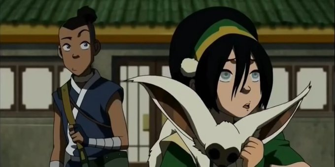 Что же до отношения Тоф к Сокке - то её интерес носит больше инстинктивный характер. Она вышла в люди и внезапно столкнулась с целым парнем, а поскольку период полового созревания ну так-то уже идёт помаленьку, уже и начинают появляться определённые мыслишки касаемо особей мужского пола. Мягкотелый Аанг для неё не так серьёзен, а вот в Сокке она видит этакого условно-натянутого мячо, который тебе лидер, боец, бумерангокидательный спец, в общем веет маскулинностью хоть какой-то. А ей, с её характером, всё же парни посерьёзней нужны.