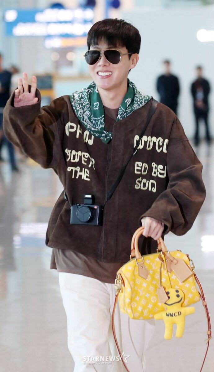 Человек, который воплощает собой слово "стиль", вот как есть. Скажи мне кто-то, что можно надеть светлые брюки, коричневую кофтюлю, зеленый платочек на шею и приправить это жёлтой сумочкой, я бы вряд ли представила что-то эффектное, но тут появляется Чон Хосок и представлять ничего не надо, он уже всё организовал. Он выглядит в этом совершенно гармонично, а дополняет всё собственной уверенностью и плавной походкой. Прошёл, поулыбался всем, раскидал сердечек и помахиваний, а потом скрылся в зоне ожидания. Лёгкого полёта тебе, дорогой, с нетерпением и предвкушением ждем всего, что ты успел включить в своё расписание.