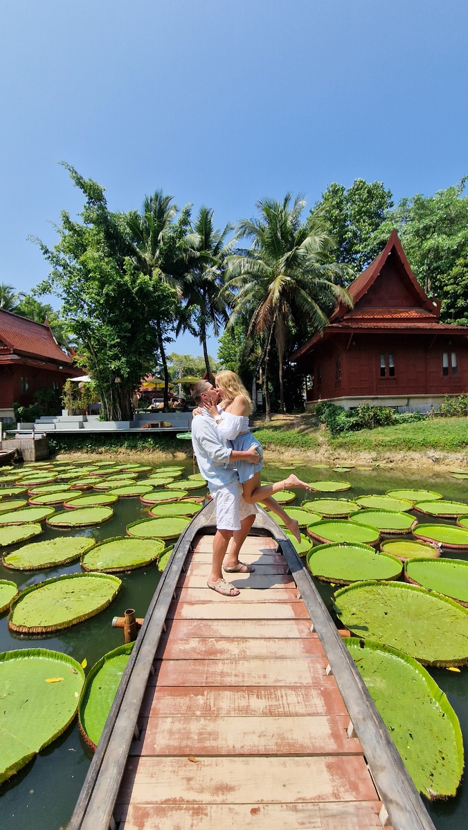 Расскажу поподробнее про одну из самых расприаренных туристических локаций Пхукета. Ma Doo Bua Cafe - кафе с гигантскими кувшинками. Локация действительно невероятно красивая и необычная, но впечатления неоднозначные. 1. Это не просто кафе, это прям фотозона с фотографом и платным входом. При входе вам бронируют время фотоссесии на лодке, посреди озера с кувшинками. Мы приехали к 10, нам назначили время на 12-00, так как уже было много людей впереди нас. 2. Самостоятельно сфотографироваться в других локациях кафе, пока ждёшь свою очередь на фотоссесию, можно только сделав заказ. В кафе очень жарко, оно открытое, по сути это просто навес от тени с вентиляторами. Ко всем локациям очень большие очереди, желающих сфотографироваться много. 3. Ко времени, когда подошла наша очередь фотографироваться на лодке, мы уже устали от жары. Но нас ждало следующее испытание - раскаленная лодка и обжигающее полуденное солнце. Глядя в небо, невозможно открыть глаза, но на этот случай у фотографа ес