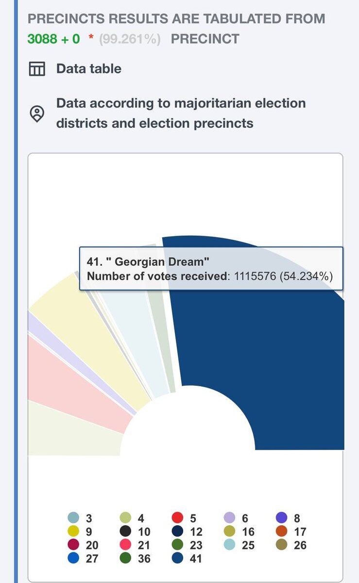 На выборах в Грузии правящая партия «Грузинская мечта» при подсчёте уже 99,3% бюллетеней набирает 54,2% голосов. Их антагонисты «Единое национальное движение» существенно просели, скатившись с 27,2% в 2020 году до 10,3%. И в целом, евролиберальная оппозиция потерпела поражение, в грузинском обществе она утратила доверие. Никакой оранжевой революции или переворота роз не будет. Может быть, отдельные стычки. «Грузинскую мечту» многие считают пророссийской партией. Да, действительно, в последнее время этой политической силой у власти было предпринято ряд шагов, которые можно интерпретировать как существенный поворот в сторону России. А именно: это отказ присоединяться к антироссийским санкциям, принятие законов об иноагентах, запрет ЛГБТ-пропаганды и признание ошибкой вторжение в Южную Осетию в 2008 году. Но не будем забывать, что пока ещё президент Грузии, бывшая французский посол Саломе Зурабишвили, которая сейчас стоит в жёсткой конфронтации с правящей партией, в 2018 году победила