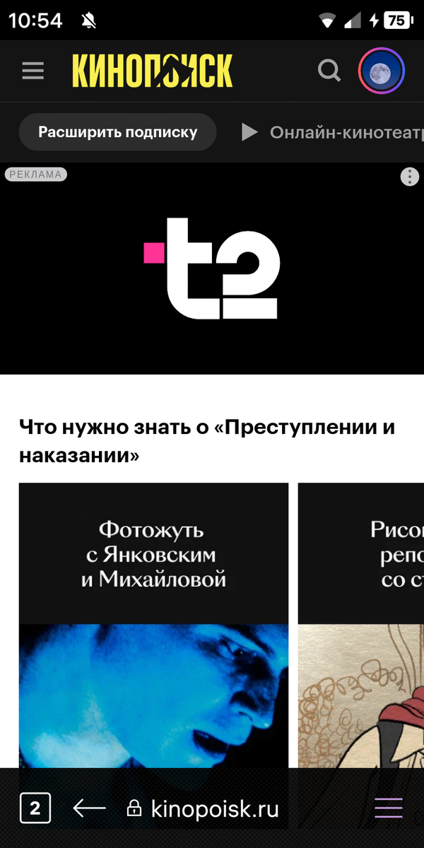 Вот мы и на странице онлайн-кинотеатра Кинопоиск. Удивительно, но этот сайт оказался легче, чем большинство банковских. Хотя, конечно, это сравнение не совсем уместно, но всё же. Переходим на вкладку фильма Холоп 2: