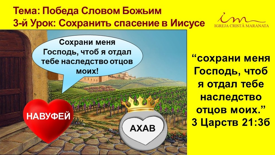«Сохрани меня Господь, чтоб я отдал тебе наследство отцов моих!» 3 Царств 21:3б. Детям Сегодня мы научимся хранить нечто особенное: наше спасение! И мы узнаем историю человека по имени Навуфей, которая учит нас бережно относиться к тому, что дал нам Бог. Вы когда-нибудь слышали о винограднике? Виноградник – это место, где растет виноград, и в Израиле иметь виноградник было большим благословением. Виноградники передавались от отца к сыну и имели большое значение для семьи, так как служили продовольствием. У Навуфея был виноградник, который он получил от своих родителей. Он очень любил этот виноградник и бережно ухаживал за ним. Но был царь по имени Ахав, очень непослушный Богу, который жил во дворце рядом с виноградником Навуфея. Однажды Ахав посмотрел на виноградник Навуфея и захотел, чтобы виноградник стал его. Ахав пошел к Навуфею и сказал: «отдай мне свой виноградник; из него будет у меня овощной сад, я дам тебе виноградник лучше этого или даже заплачу тебе за него». Навуфей ответи