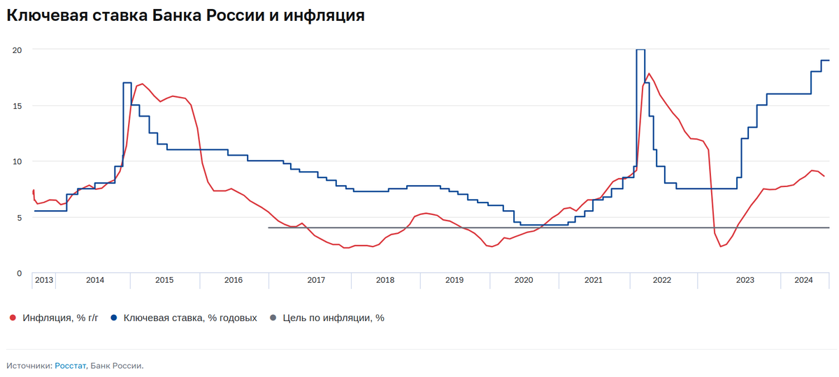 В марте 2023 года инфляция и ключевая ставка были одинаковыми — по 7,5%. Со следующего месяца и до настоящего времени ключевая ставка выше инфляции.
