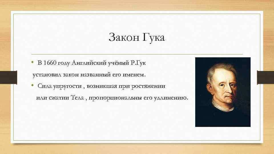 Роберт Гук – Английский учёный открывший силу Упругости в 1660 году, то есть в свои свежие 35 лет. Он был не просто учёным физиком, но и механиком. У него была работа на, которой он работал. Сила упругости – сила возникающая в результате деформации. Гук родился 18 июля 1635 года и за всю свою жизнь он открыл много интересных вещей, которые обычно не рассказывают на уроке. Его многие считают отцом самой физики. Он сделал более 10 открытий за всю свою жизнь и это реально много по сравнению с другими учёными физиками. Он работал в лондонском королевском обществе. Чтобы рассчитать силу упругости нужно знать формулу, которая выведена лично им! F-сила упругости K-коэффициент упругости ∆t – длинна упругости В результате выводиться такая формула F=K×∆t. Вот та самая формула, которая выведена Робертом Гуком в результате его открытия. Проведём очень простой опыт с пружиной из жизни. Если взять обычную пружину и начать её растягивать, то она станет по размеру больше, но если же пружину перестать