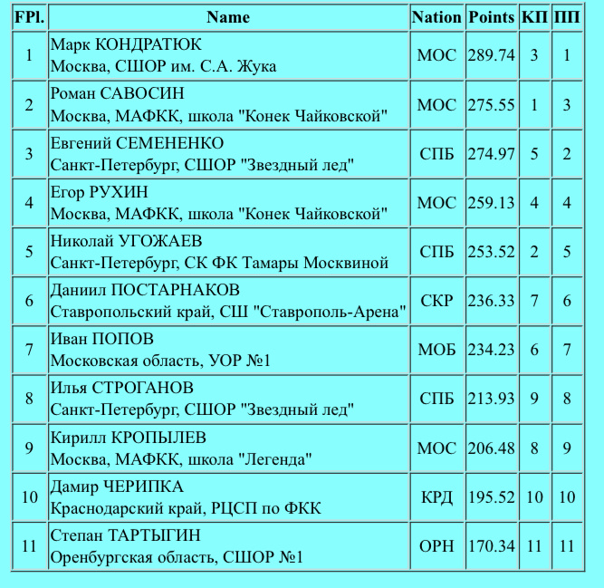 Просмотр соревнований в мужском одиночном катании — это всегда особые эмоции. Много риска, сложнейших элементов, кто-то сильнее технически, кто-то выделяется презентацией. 4S+1Eu+2S, 2S, 3A+2A, 3A, 4T+3T (степ-аут), 3Lz, 3F. 148.67, 234.23. Неожиданно видеть Женю на 5 строчке после короткой программы. Но это спорт и уж очень грубые ошибки были в первый соревновательный день. 4F, 4T, 2S+3T (аналогичный каскад был и в КП), 3A+3T, 3A+2A+2A, 3Lo, 3F. Если не считать бабочки на каскаде, все сделано хорошо! Не без фирменной борьбы за выезд, но неплохо, надо отдать должное, «клевков» на выездах стало меньше. 187.62, 274.97. 4Lz+3T, 4F, 4Lo (степ-аут и касание рукой льда), 4S, 4T, 3A+Eu+2S, 3A+2A. Технический набор впечатляет, молодец! Непрыжковые элементы и презентация совсем слабенькие. 171.17, 259.13. 4Lz, 4F, 4T, 3A+3A (тройка на выезде), 4S+2T, 4S, 3Lz+1Eu+3S. Практически все элементы выполнены на хорошие +. Качественно и уверено. 199.44, 288.74. Серьезная заявка на лидирующие позиции