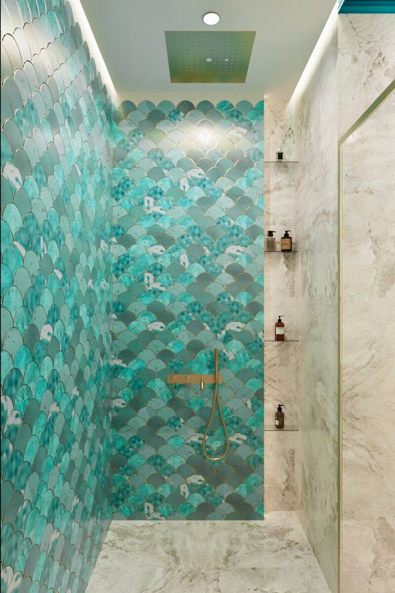 Настало время показать вам потрясающий интерьер с топовой коллекцией «Рыбья Чешуя», которую мы изготовили для санузла Анастасии. Мы уже делились с вами фото с производства, а теперь можно насладиться этой красотой на фотовизуализации. Всё-таки, морская тема просто идеально подходит для облицовки санузлов. Благодаря широкой палитре переливов тонов от оттенка ясной водной глади до цвета горизонта над водой получилась необычная картина из чешуек, которую хочется рассматривать снова и снова. Стоит отметить, что в данном интерьере голубые оттенки играют особенно утонченно, ведь их подчеркивают мелкие золотые детали в виде смесителей и окантовок дверных проемов. Это на заметку тем, кто хочет добиться легкого налета роскоши и элегантности при использовании подобной облицовки. В общем, красота просто неописуемая, а главное клиент остался полностью доволен! Тел.: WhatsApp/Telegram: +7 926 316-69-87 +7 800 500-87-87 Бесплатно по России Сайт:pentaceramica.ru Наш адрес: Москва, Дмитровское ш. 163