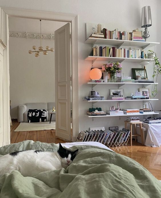 Вариант оформления гостиной и спальни в белых и бежевых тонах с акцентными деталями Лампа-шар Стеллаж, собранный самостоятельно из стеллажной системы и полок Металлическая подставка под журналы/виниловые пластинки Постельное белье оливкового цвета Ковер Похожая люстра Диван Серебристая лампа