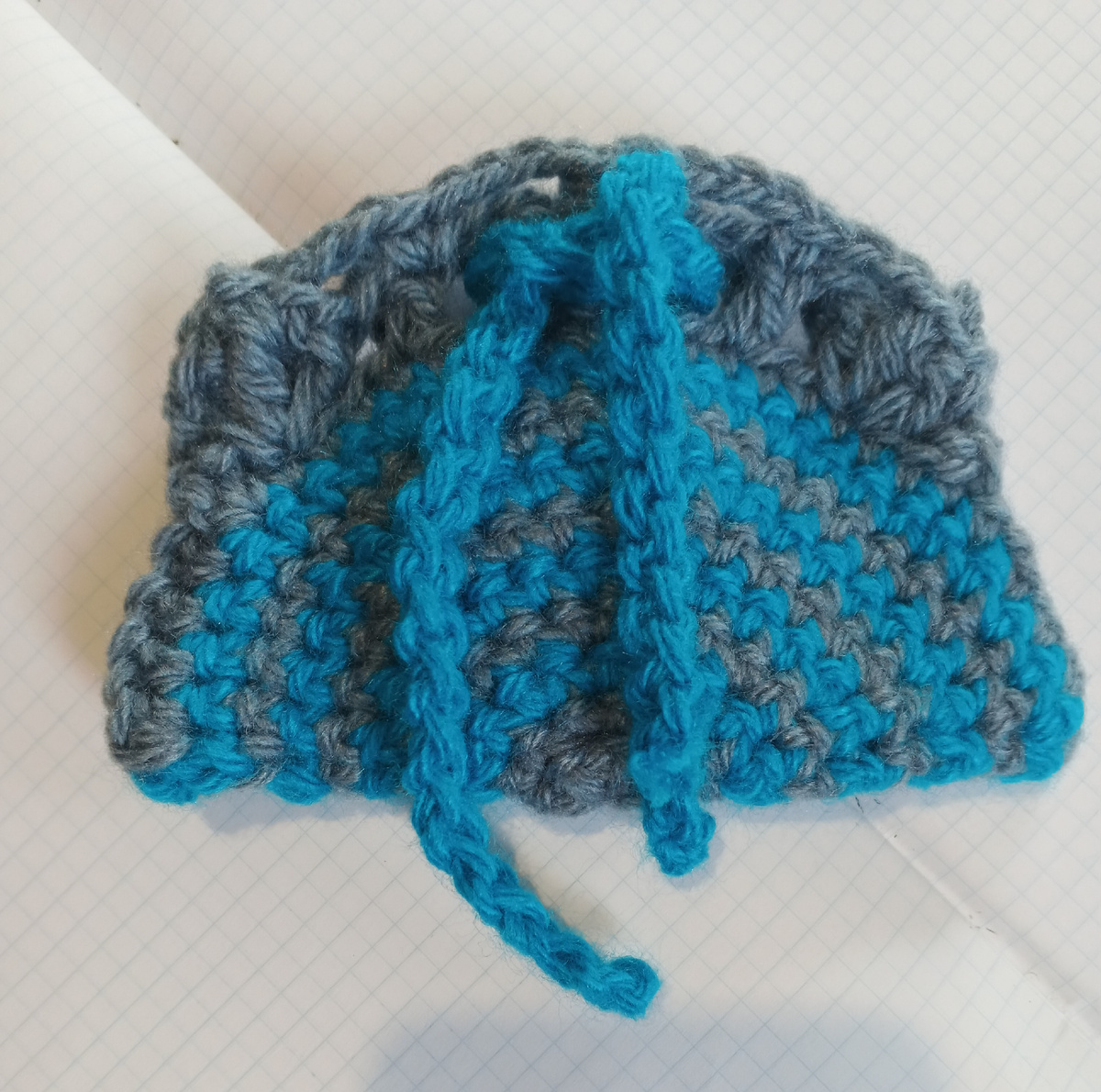 Необходимые материалы: Два цвета пряжи по 20 гр 200м на 100гр; Крючок 5; Ситец 10*10 см; Наполнитель. 1. Работу начинать серым цветом. Набрать цепочку из 3 воздушных петель. 1ряд:Провязать 6 ст без накида в цепочку. цветпряжи менять в каждом ряду. Провязать 8 рядов по кругу, делая прибавки по следующей схеме: 2 ряд- прибавлять в каждом столбике( провязать 2 столбика в один столбика предыдущего ряда) 3 ряд- в каждом 2м 4ряд- в каждом 3м 5 ряд- в каждом 4м 6 ряд- в каждом 5м 7 ряд- в каждом 6м 8 ряд- в каждом 7м. Сложить получившийся круг пополам, по бокам с двух сторон по лицевой стороне соеденить столбиками без накида серым цветом( фото 2) Получился мешочек (фото 3) Верхнюю часть мешочка обвязать серым цветом по схеме 1. Связать цепочку из 50 воздушных петель. Продеть цепочку в отверстия каймы. Зафиксировать. Сшить подушечку из ситца, наполнить наполнителем. Иголочки с нитками вколоть в подушечку. Подушечку и катушки с нитками вложить в мешочек, завязать шнурочком.