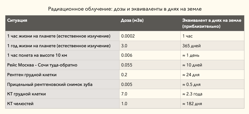 Начнём с краткой теории и статистики о дозах радиации, которые мы получаем просто находясь на планете. Для удобства расчётов я буду использовать верхние границы диапазона, чтобы учесть наиболее значимые случаи. Например, если мы летим ближе к экватору, то дозы радиации будут выше. Также, при компьютерной томографии или рентгенографии дозы варьируются в зависимости от аппарата. И даже находясь на земле, мы получаем дозу радиации, которая меняется вместе со сменой времени суток. Я собрал данные в таблицу, которая поможет рассчитать облучение в различных ситуациях — от перелётов до медицинских процедур. Например, перелёт Москва – Бангкок туда-обратно (примерно 18 часов) по уровню радиации эквивалентен 18 дням, проведённым на земле. Для населения, которое не работает в сфере атомной промышленности, авиации или медицины, норма дополнительного облучения (без учёта природного фона) составляет не более 1 миллизиверта (мЗв) в год. Это эквивалентно примерно 130 дням естественного радиационного ф