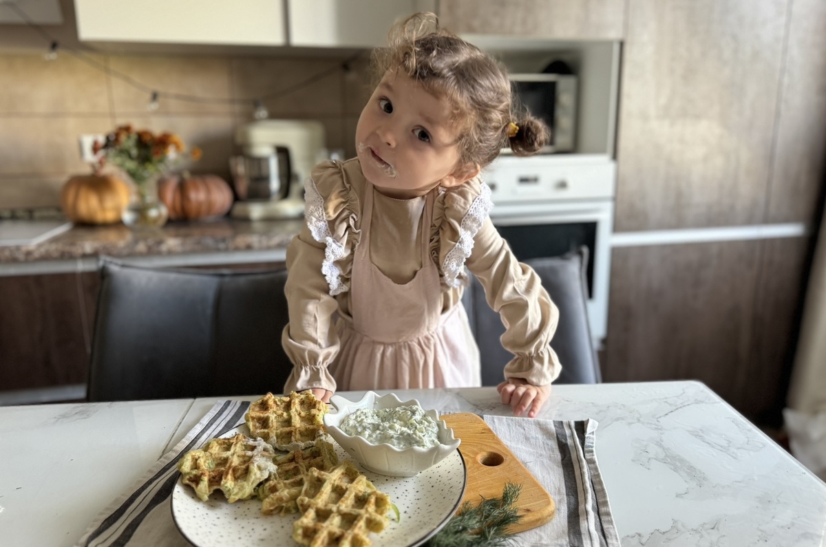 Мои дети очень любят кабачковые вафли. Считаю это блюдо очень удачным, а благодаря тому, что оно из овощей, еще и полезным. Нам нравится дополнительно к такому завтраку готовить чесночный соус с зеленью и огурцом, который добавляет нотки свежести. Он также отлично сочетается с мясом рыбой, овощами и может даже стать отличной заправкой для салатов. Готовится такой соус очень быстро, не требует особой подготовки и навыков - мне помогают делать его даже малыши. Мы готовили на днях кабачковые вафли и соус и захотелось поделиться вкусными рецептами и с вами! Сливочный мягкий сыр – 100 г Сметана – 3 ложки Огурец – 1 шт среднего размера (у нас были большие огурцы, поэтому взяла половинку) Чеснок – 2 зубчика Зелень -- несколько веточек укропа Соль по вкусу 2.Добавляем сливочный сыр и сметану 3.Пропускаем чеснок через пресс или натираем на мелкой терке 4.Нарезаем мелко зелень 5.Солим 6.Все перемешиваем и подаем к столу! Как видите, соус готовится очень быстро. Мне он так нравится, что я мог