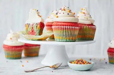 Кексы не могут быть более красочными, чем эти! Эти великолепные радужные кексы, которые обязательно понравятся гостям на вечеринках, состоят из шести слоёв разноцветного бисквита, покрытого густой глазурью из сливочного крема и посыпкой. Они отлично украсят любой праздничный стол. Вот рецепт радужных кексов. Продукты необходимые для их приготовления: