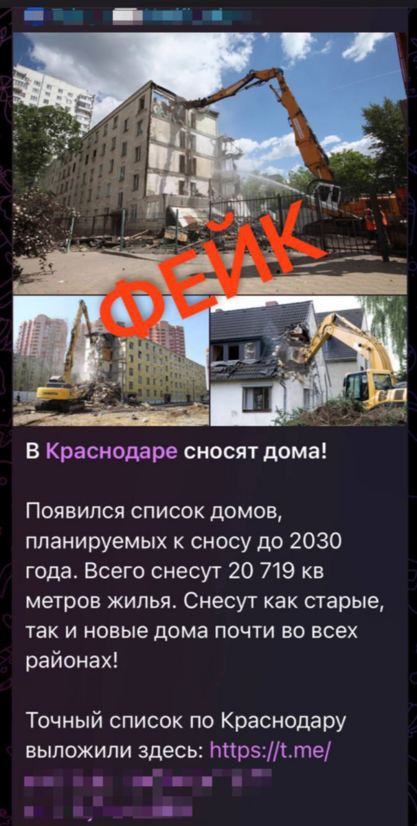 В нескольких каналах 27 октября начала появляться информация, о, якобы, массовом сносе домов в Краснодаре. В неизвестных пабликах сообщают, что множество домов снесут к 2030 году. Под постом предлагается перейти по ссылке, чтобы ознакомиться со списком. Однако, ведет страница на закрытый телеграм-канал. Жителей Краснодара убедительно просят не доверять подобным ресурсам. Такую рекламу используют каналы для привлечения подписчиков. Горожан попросили доверять лишь достоверным источникам и официальным телеграм-каналам. Больше новостей в нашем Telegram.
