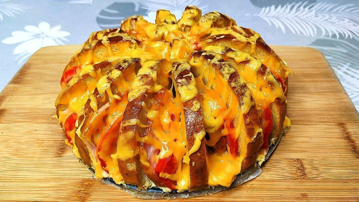 Прекрасный завтрак для всей семьи. Обязательные ингредиенты для коблера – это сыр, яйца и ваша фантазия. По вкусу это блюдо напоминает горячие бутерброды и пиццу одновременно. 1. Батон режем на кусочки. 2. Часть сыра и ветчину режем на ломтики. 3. Вторую часть сыра трём на тёрке. 4. Помидоры нарезаем кружочками. 5. Кусочки батона немного смазываем маслом и выкладываем на противень «солнышком». 6. Между кусочками батона выкладываем пластинки сыра, ветчины и помидора. 7. В миску выливаем молоко. Добавляем соль, специи, яйца и майонез. 8. Взбиваем всё венчиком. 9. Полученную смесь выливаем на противень с батоном. 10. Посыпаем натёртым сыром. 11. Запекаем коблер в духовке при 180 градусах, около 25 минут. 12. Если верх будет подгорать, накрываем фольгой. Больше рецептов вы сможете найти на моём канале Рецепты с Фантазией. Ещё больше рецептов завтраков вы можете увидеть здесь. Понравился рецепт? Пишите в комментариях, мне будет приятно.