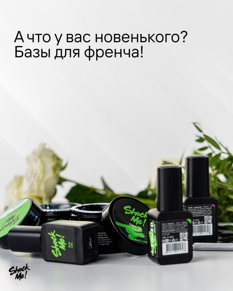 Shock Me French collection - базы идеально подходящие для френча. В коллекции представлены 5 оттенков, с помощью которых вы подберете идеальное сочетание кожи клиента и цвета базы. База имеет густую консистенцию, плотная и укрывистая в один слой. Упругая и не дает просадки, сколов и отслоек при носке. Напоминаем, что длинна свободного края не должна превышать 3-5 мм, так как слабые ногти склонны к скручиванию и это может приводить к отслойкам. Подготовка ногтя: 1 Снять старое покрытие при наличии 2 Убрать липидный слой с ногтя пилкой или фрезой 3 Выполнить маникюр 4 Удалить пыль с помощью обезжиривателя 5 Нанести дегидратор 6 Нанести праймер 7 Рекомендуем нанести базу Ruber fast от Shock Me тонким слоем и просушить в UV лампе 60 сек для облегчения коррекции. Тонкий слой прозрачной базы позволит вам при следующей коррекции оставлять часть базы на ногте, не спиливая её целиком и таким образом не травмировать ногтевую пластину. 8 Нанести выравнивающий слой цветной базы, перев