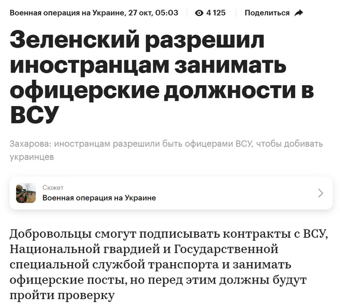 1. Уменьшить риск свержения Зеленского внутренними силами армии и другими силовыми структурами, чем больше иностранных офицеров, тем сильнее позиции Зеленского (тут иностранные спонсоры хотят по максимуму на сколько возможно затянуть войну и как можно больше получить смертей с обеих сторон, т.е. как можно больше максимизировать прибыль от свой 70 летней кампании по выращиванию бандеровцев еще с 1945-х годов в Канаде, а с 1990-х на Украине) 2. Чтобы иностранные офицеры НАТО получили реальный боевой опыт (на Западе думают, если что-то еще можно получить с Украины, то почему бы и нет. Боевой полноценный опыт крупномасштабной войны сейчас по сути только есть у армии России и у Украины). Если случится заварушка с НАТО, НАТО будет не легко против опытной армии России. Пост автора MezduStrok. Читать комментарии на Пикабу.