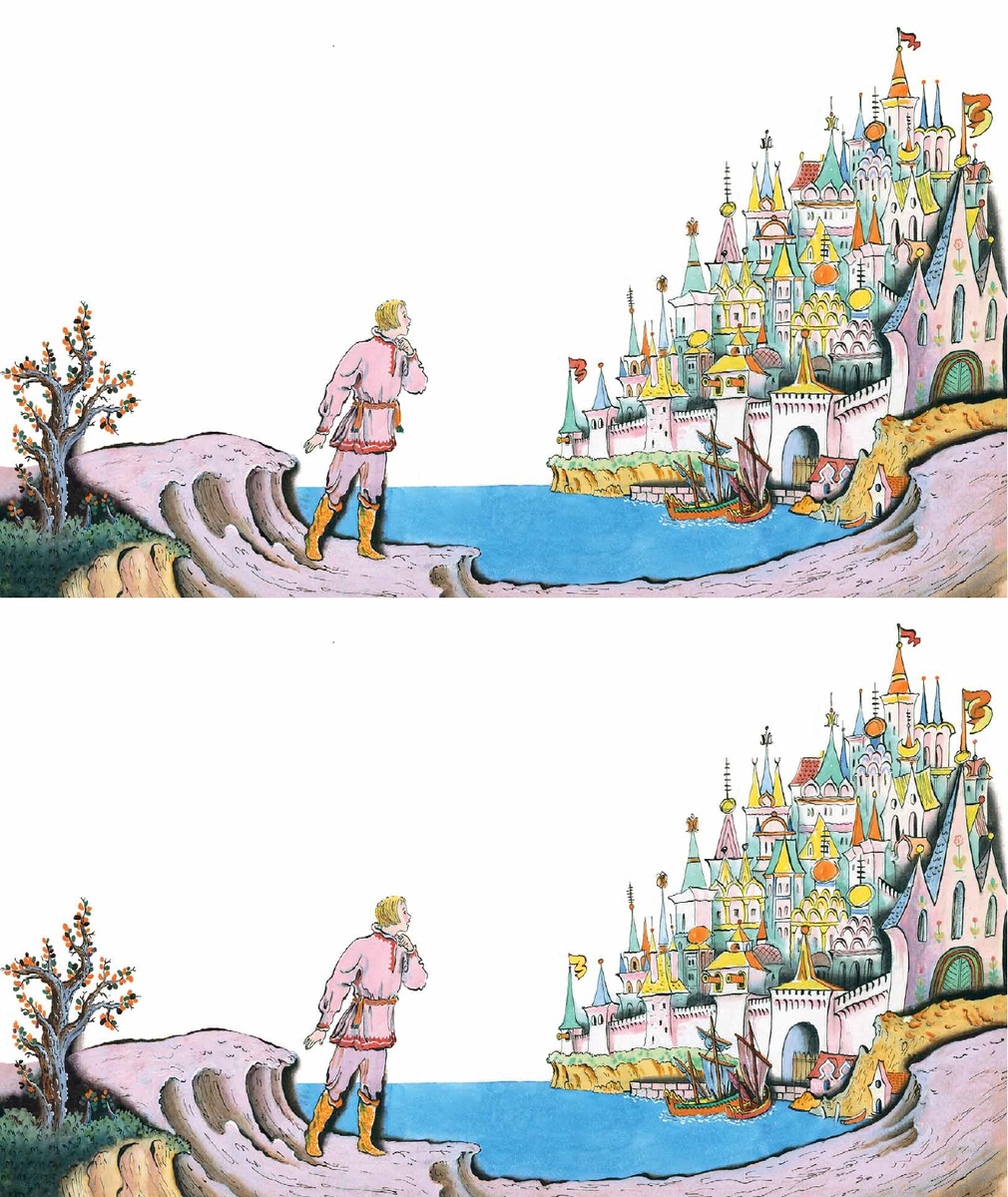 Недавно мы делились с вами большой гордостью - выпустили сборник сказок Александра Пушкина с классическими, всем известными иллюстрациями Владимира Конашевича. Получилась не книга, а настоящее произведение искусства. В сборнике 4 сказки Пушкина - «Сказка о царе Салтане», «Сказка о рыбаке и рыбке», «Сказка о мертвой царевне и семи богатырях», «Сказка о золотом петушке» - и почти на каждой странице волшебные рисунки! Поверьте, это просто загляденье! Но такую книгу лучше один раз увидеть, чем сто раз про нее услышать, поэтому в конце статьи не пропустите ссылку на видеолисталку сборника. А пока попробуйте найти 5 отличий, которые мы "спрятали" на иллюстрации к “Сказке о царе Салтане". Ищите их между двумя версиями изображения, сопоставляйте, чтобы не пропустить даже маленькие детали. Нажимайте на картинку - она откроется в большем размере. Пишите в комментариях, сколько и каких отличий вам удалось найти. Мы подскажем, правильно вы угадали или нет, и где спрятались остальные отличия, если
