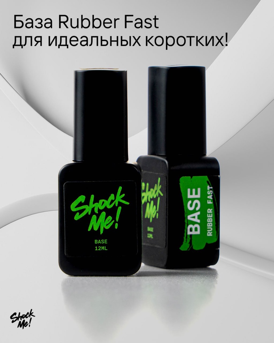 База имеет среднюю густоту, что отлично подойдет как для новичков так и для профессионалов. Упругая и не дает просадки, сколов и отслоек при носке. Высота полимерной пленки 0,7 мм, что отлично подходит для выравнивания ногтевой пластины. Напоминаем, что длинна свободного края не должна превышать 3-5 мм, так как слабые ногти склонны к скручиванию и это может приводить к отслойкам. Подготовка ногтя: 1 Снять старое покрытие при наличии 2 Убрать липидный слой с ногтя пилкой или фрезой 3 Выполнить маникюр 4 Удалить пыль с помощью обезжиривателя 5 Нанести дегидратор 6 Нанести праймер 7 Для тонких и слабых ногтей рекомендуем нанести базу Ruber fast от Shock Me тонким слоем и просушить в UV лампе 60 сек 8 Нанести выравнивающий слой базы, перевернуть руку дать сформироваться капле и просушить в UV лампе. 9 Допускается промежуточная просушка, это никак не отразится на носкости материала. 10 Время полной полимеризации в UV лампе 120 сек 11 Нанести гель-лак при необходимости просуши