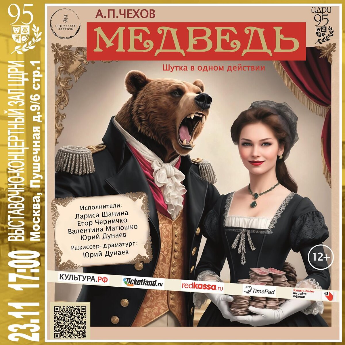 Шутка в одном действии Спектакль-шутка, наполненный обаянием молодости и красоты, а также актерским хулиганством, подарит зрителю радость, легкость и хорошее настроение. Обрести личное счастье, когда уже не надеялся на это, — что может быть лучше для любого человека, будь то мужчина или женщина, живи он, хоть где, хоть в самом глухом, «медвежьем углу», где окружающие своим поведением напоминают диких животных! К каждому судьба может повернуться самым неожиданным образом, именно так и происходит с героями водевиля «Медведь». С самого появления своего из-под пера 28-летнего А.П. Чехова эта шуточная пьеса приобрела огромную популярность, ее играли буквально на всех подмостках — в столичных императорских театрах и на провинциальных, частных и любительских сценах. Как писали первые рецензенты, «в маленькой шутке Чехова публика встретила сразу и грубую житейскую правду, и душевную психологию, и невероятный фарс, и ярки