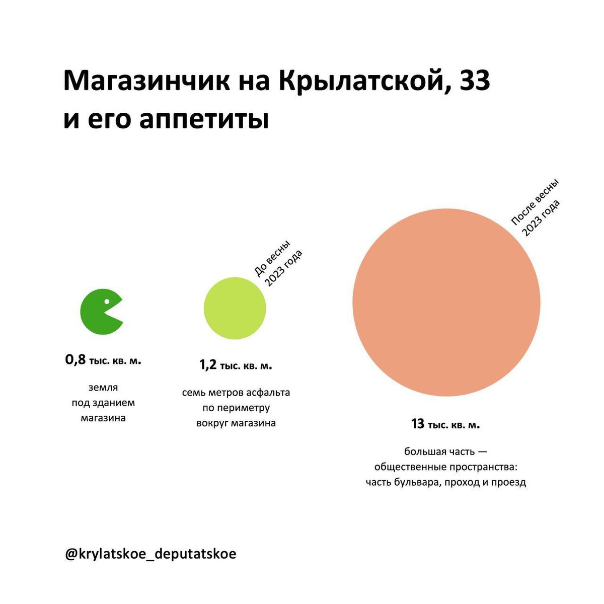 Крылатская, 33 — по другую сторону от «колодца», совсем рядом с Крылатской, 23. В проекте - целых три жилые высотки под названием Эко Тауэр от неизвестного застройщика без истории и успешных реализаций СЗ Сияние. На территории части бульвара и проезда. Тут стоял одноэтажный магазин «Пятёрочка». А до этого он был баром. У владельца в аренде была земля под зданием и полоса асфальта вокруг. Этого долго хватало, чтобы эксплуатировать здание. И вот в 2023 году владелец здания заказал у Москомархитектуры проект межевания. И перемежевал арендуемый собой участок 33 так, чтобы он вырос в семь раз. Поглощенный участком 33 участок 69 раньше был продолжением Осеннего бульвара. В 2006 году Совет депутатов отдал его во временное пользование под экологическую парковку. А участок 107 — это проезд и проход. То есть у жителей забрали бульвар и проезд, разрешив строить на этой земле многоэтажки. Когда Совет депутатов запросил у ГЗК протокол с обоснованием, ему отказали. Инициативная группа жите