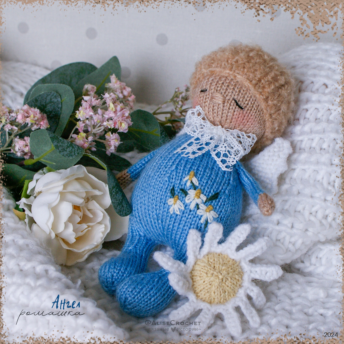 Жил-был маленький ангелок по имени Ромашка. Он был очень добрым и милым созданием, но отличался от других ангелов тем, что всегда носил с собой большую мягкую подушку в виде ромашки. Эта подушка была для него настоящим сокровищем – она дарила ему уют и защищала от всех бед. Подушка была волшебной – она всегда пахла свежим луговым ветром и мягкими лепестками цветов. Когда ангелок засыпал, держал её в своих маленьких ручках, ему снились самые чудесные сны о том, как он летает среди облаков, играет с солнечными лучами и собирает росу на утренних травах. Однажды утром Ромашка проснулся раньше обычного. Солнце уже поднялось высоко над облаками, а вокруг царило удивительное спокойствие. Малыш решил отправиться на прогулку по небесным садам, прихватив с собой любимую подушку. расход пряжи: не большой