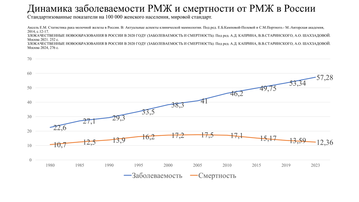По последним статистическим данным в 2023 г. в России раком молочной железы (РМЖ) заболела 82499 женщин, а умерло от этой болезни 20608 больных (6). 53 года назад, в 1970 г. в РСФСР заболело 13988 женщин и мужчин, а умерло 6955 (2) при численности населения 130 млн. 79 тыс. То есть, число ежегодно заболевающих увеличилось в 5,9 раза, а умирающих – в 3 раза. На протяжении 43 лет заболеваемость неуклонно растёт, ежегодно прибавляя около 1 %. Кривая, описывающая динамику смертности, более сложная: с 1980 по 2000 гг. рост, с 2000 по 2010 гг. стабилизация, в последние 13 лет – снижение! Налицо нарастающая успешность лечения! За счёт чего? Наиболее вероятные причины: раннее выявление заболевания благодаря использованию профилактической маммографии, углублённая оценка биологии опухоли, позволяющая индивидуализировать применение новых и ранее известных лекарств. Каков риск заболеть РМЖ и умереть от этой болезни? На 2023 г. риск заболеть на протяжении жизни (до 75 лет) равен 6,45%, умереть – 1,