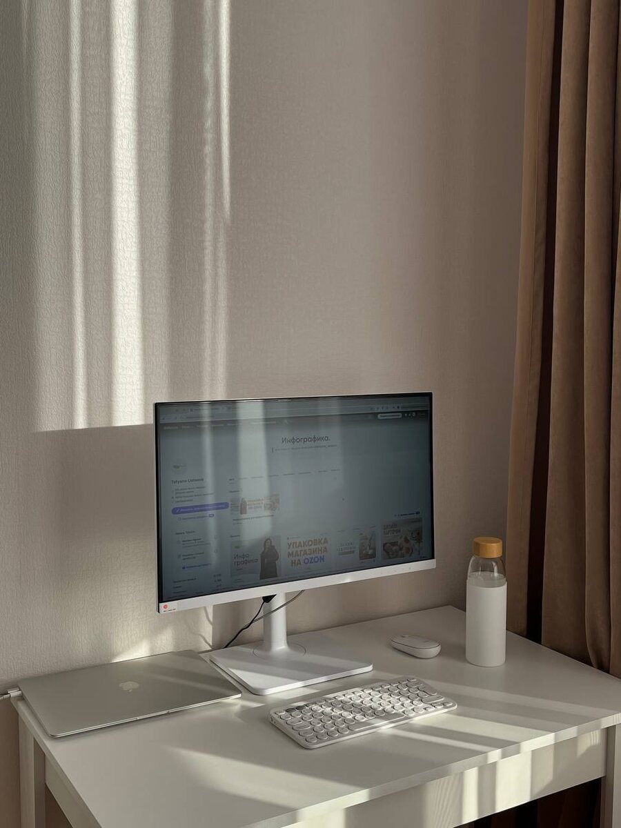 В личку иногда поступают вопросы про то, какой техникой я пользуюсь в работе. Наверное и тут этим полезно будет поделиться. Сразу говорю, что я не особо разбираюсь в характеристиках. Просто делюсь своим опытом как человек, который занимается дизайном. Лет 5 назад у меня появился ноутбук от Huawei. Уже не помню точную модель, но диагональ была 14. Очень испортила себе зрение тогда, работая с таким маленьким экраном. Также страдает осанка, т.к голова постоянно опущена вниз, перенапрягается шея… короче, не советую работать на ноутбуке на постоянной основе. Полтора года назад решила приобрести монитор, и это было лучшее решение. Даже жалею, что не сделала это раньше. 23.8" Монитор MSI Modern MD241PW белый Всё в нем нравится: начиная от внешнего вида заканчивая цветопередачей и защитой для зрения. Глаза и правда устают меньше + можно легко регулировать высоту и наклон, что тоже удобно. Apple macbook air m1 Ноутбук 13.3", Apple M1 (3.2 ГГц), RAM 8 ГБ, SSD, Apple M1 Покупала на озон (пережива
