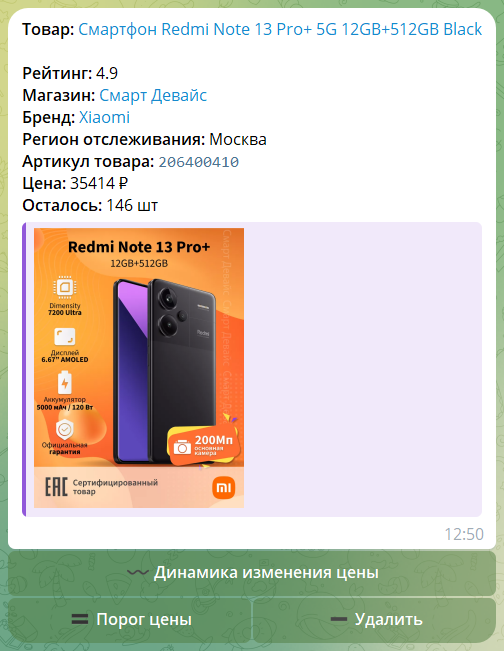 Дополнительно в карточке товара можно установить порог цены при котором будет приходить уведомление о том, что стоимость товара стала меньше установленного порога. Например, установлен порог цены 900 рублей для товара стоимостью 1000 рублей и когда цена товара опуститься ниже 900 рублей бот пришлёт уведомление, что товар подешевел и порог цены будет установлен в текущую стоимость товара. Если в общих настройках включена функция фиксирования порога цены, то порог цены останется на прежнем уровне - 900 рублей.