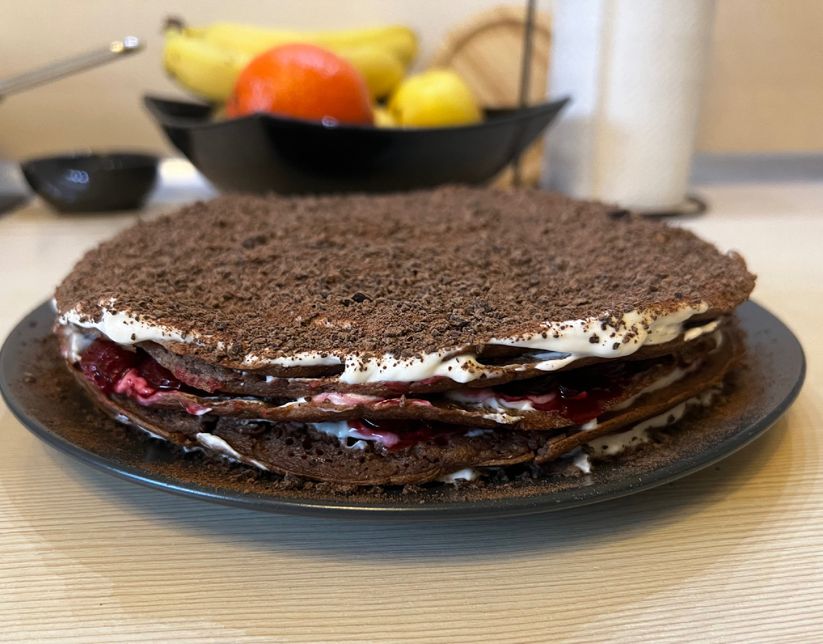 Простой и быстрый торт выходного дня, новая подача ПП блинов. *можно не посыпать сверху тертым шоколадом, тогда калорийность останется небольшой. Ингредиенты (тесто): Ингредиенты (крем): Приготовление: Из замороженной вишни варим конфитюр. Я беру 300 грамм замороженной вишни, выкладываю в разогретый сотейник, доводим до кипения на среднем огне. Уменьшаем нагрев, добавляем крахмал и увариваем. Пока выпекаем блинчики конфитюр остынет. Готовим тесто на блины: смешиваем яйца, молоко, муку, разрыхлитель, сахарозаменитель, какао. На разогретой сковороде выпекаем блинчики. Мягкий творог и рикотту смешиваем с ванильным сахарозаменителем. Смазываем слои поочередно, начиная с твороженной прослойки, затем джем и так до самого верха. Верх также смазываем кремом и посыпаем натертым шоколадом (шоколад перебила в блендере). Калорийность: Приятного аппетита!