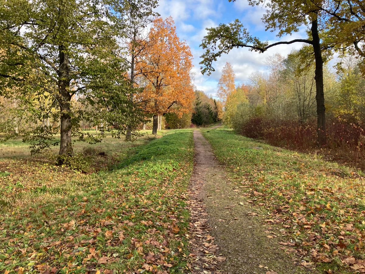 Последнее время хочется всё дальше и дальше забираться в глушь, где мало людей. Поэтому мне нравится гулять в Баболовском парке, в будний день тут можно оказаться на совершенно пустынной дороге. Изредка один-два человека повстречаются. Особенно в холодную погоду - благодать, никого нет. А красота неописуемая. Осенью загораются все оттенки жёлтого и красного. И по обочинам в лесках есть грибы. Грибы не все съедобные, но все красивые И на пруду хорошо. В лесу пурпурные листья. Такие бывают только в октябре. Краснотал и весной, и осенью украшает парк. И солнце светит нежно и трогательно. Любимые мои дороги.
